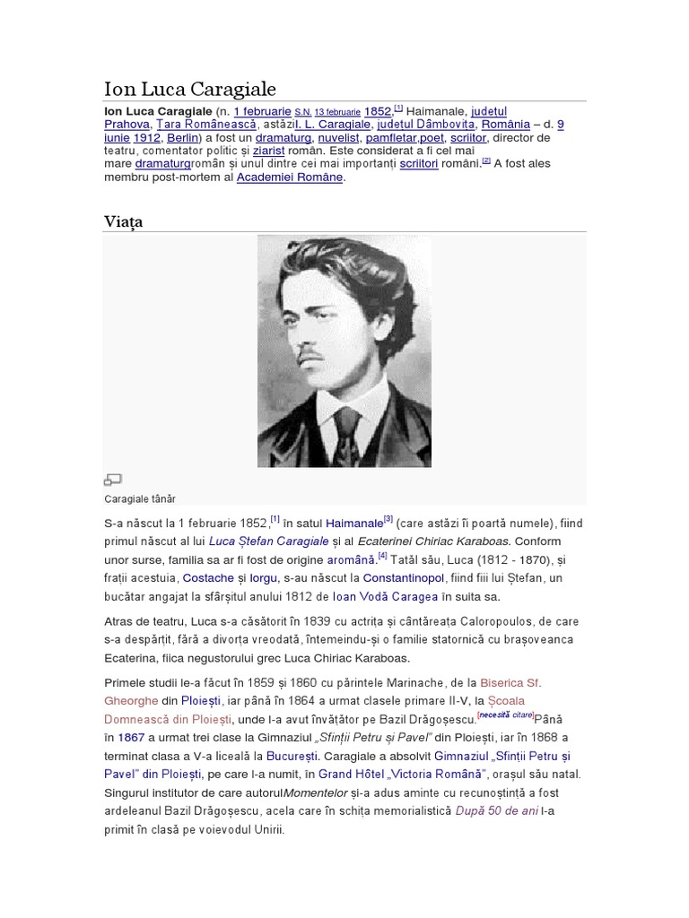 vizitati articolul complet aici : https://gorjeanul.ro/revizorul-scolar-i-l-caragiale-si-invatamantul-romanesc-la-sfarsit-de-secol-xix/ 1 februarie 1852, haimanale, județul prahova, astăzi i. El este considerat cel mai mare dramaturg român, dar el a scris şi nuvele, schiţe şi poezii care reprezintă valori inestimabile ale literaturii poporului nostru. Caragiale is born on january 30th, 1852, in the haimanale village.