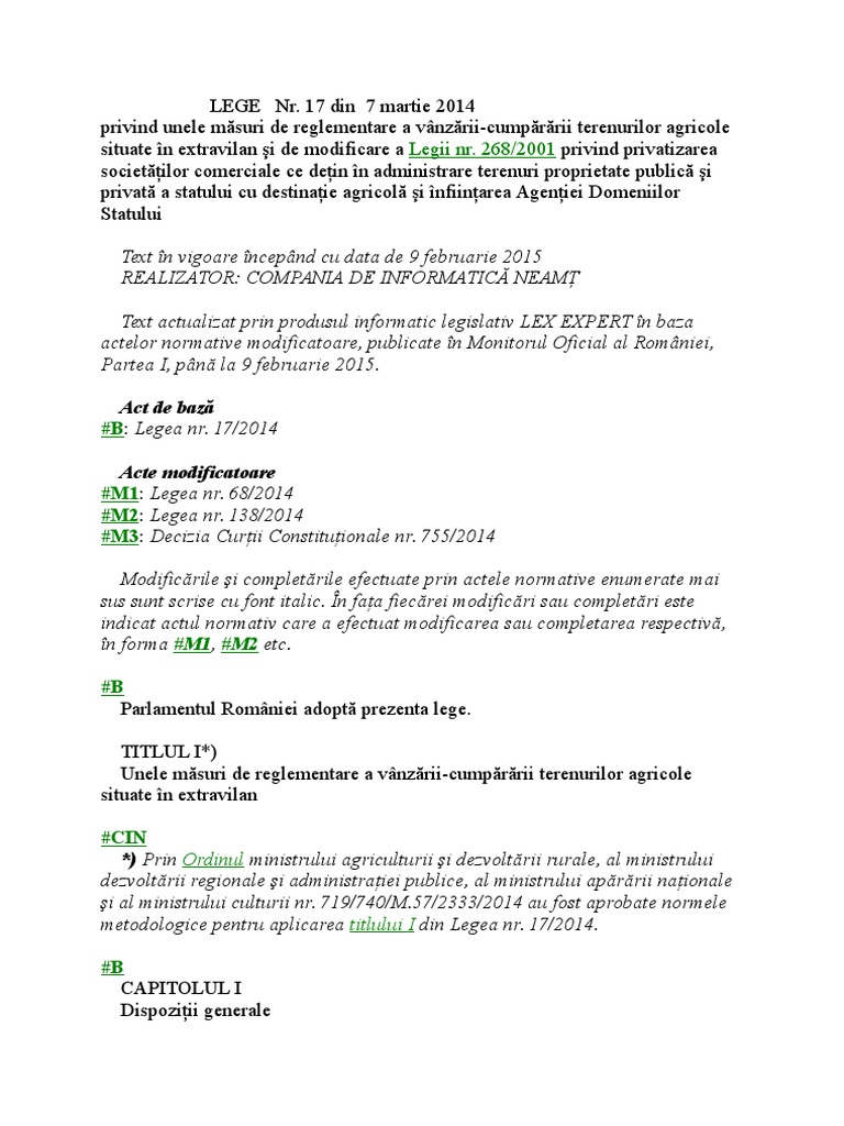 vizitati articolul complet aici : https://ziarulprahova.ro/2020/08/au-fost-modificate-conditiile-de-vanzare-a-terenurilor-agricole-situate-in-extravilan/ 129/ 31 mai 2017 privind aprobarea ordonanţei de urgenţă a guvernului nr. 268/2001 privind privatizarea societăţilor comerciale ce deţin în administrare terenuri proprietate publică şi privată a statului cu destinaţie. 51 din 28 martie 2013 privind completarea unor acte 51 din 28 martie 2013 privind completarea unor acte legislative (monitorul oficial al republicii moldova, 2014, nr.