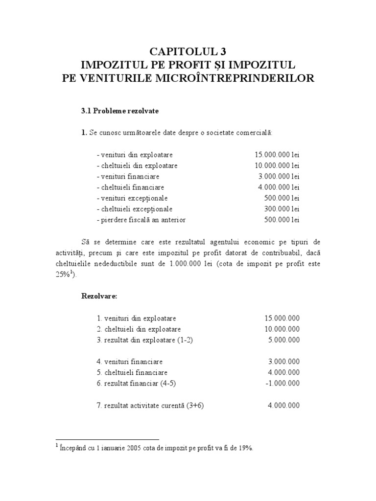 vizitati articolul complet aici : https://dokumen.tips/documents/impozit-pe-profit-probleme-rezolvate.html Cheltuieli nedeductibile = 1000 lei + 80 lei = 1.080 lei. Cand se calculeaza acum impozitul pe profit de la inceputul anului pana la 30.09.2014, stabilim daca se declara diferenta dintre impozitul pe microintreprindere calculat si impozitul de 16% si daca se face stornare la 698 = 4418. In analiza urmatoare, societatea este platitoare de impozit pe profit din trim.